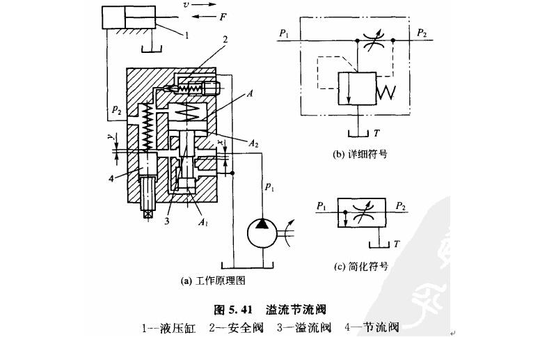 圖5.41為溢流節(jié)流閥的工作原理圖。圖中1是液壓缸.2是安全閥.3是定差溢流閥.4是節(jié)流閥。從液壓泵輸出的壓力油隊(duì),一部分通過節(jié)流閥4的閻口y.由州汕口處流出,壓力降為ρz.進(jìn)入液壓缸1.使活塞克服負(fù)載F以速度U運(yùn)動(dòng);另一部分則通過溢流閥3的閥口Z溢回油箱。溢流閥閥芯上端的彈簧腔與節(jié)流閥4的出口(pz)相通,其肩部的油腔和下端的油腔與入口壓力油如相通。在穩(wěn)定工況下,當(dāng)負(fù)載力F增加,即出口壓力pz增大時(shí),溢流閥閥芯上端的壓力增加,閥芯下移,溢流口Z減小,液阻加大,使液壓泵供油壓力P1增加,因而使節(jié)流閥前后的壓差可基本保持不變。當(dāng)pz減少時(shí),溢流閥溢流口x加大,液阻減少,使液壓泵出口隊(duì)相應(yīng)減小,同樣使基本保持不變。另外,當(dāng)負(fù)載扣超過安全閥的調(diào)定壓力時(shí),安全閥2將開啟。溢流閥閥芯的受力平衡方程為